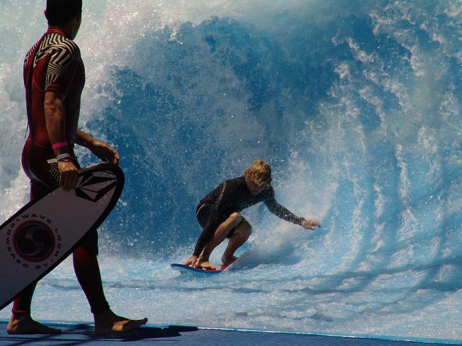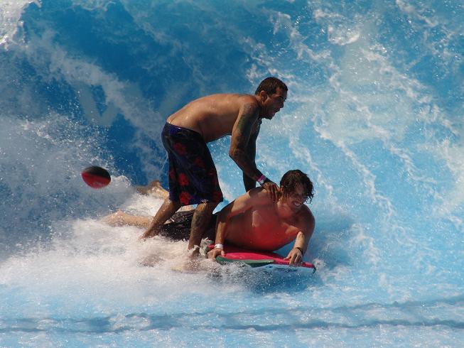 Sal gives the Wave House the "shaka thumbs up" for one very cool and fun surfing ride. The Wave House Experience - FAQ Q. How do I get to ride? A. Each wave can book with up to 10 riders per hour. Cost: $20-$45/hour depending on wave and equipment: bodyboard/custom flowboard/custom flowboard with bindings. Sign in at the Wave House Athletic Club. Q. 'Is it dangerous?' A. The FlowRider � Wave-In-A-Box is one of the waterpark industry's safest attractions. As to the Bruticus Maximus' is a skate halfpipe dangerous? But at least it's padded with 1' of foam and a layer of water. Consequently, you don't drop in on your first try. You work your way up as you gain control, speed and amplitude. Be humble, or be humbled. Pleasure and pain are part of the same stick. Be afraid' you are a 'girlie man.' You may cry before you fly. Q. 'It's not `real' surfing?!' A. Never said it was. It's a fusion of surf, skate and snow techniques. It's a cross-platform that is a blast and feels just like surfing after you master the board. A lot of surfers report that the B-Max tunes their surfing, especially their tube riding, switch stance and airs. You can get more tube time in a minute-long ride than most surfers get in a lifetime. Besides, surfing has only followed skating and snowboarding in terms of maneuvers. However, you will see moves on the B-Max that haven't yet and maybe will never be landed in the ocean. Photo by Mission Beach Online.com